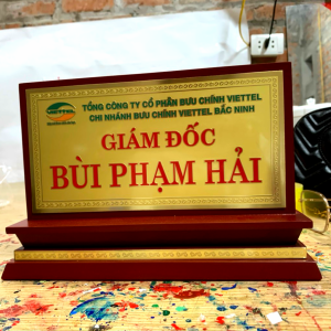 Biển chức danh đồng là một trong những chất liệu sang trọng với cách thi công bằng phương pháp ăn mòn giúp cho thể hiện được những chi tiết rất nhỏ một cách tinh xảo kết hợp với chân đế bằng gỗ là một sự kết hợp tuyệt vời.